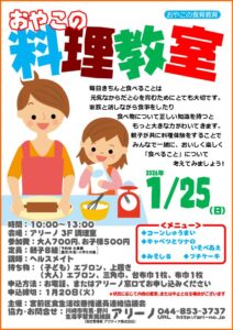 | 持ち物 | (子ども)エプロン、上履き (大人)エプロン、三角巾、台布巾1枚、布巾1枚 |